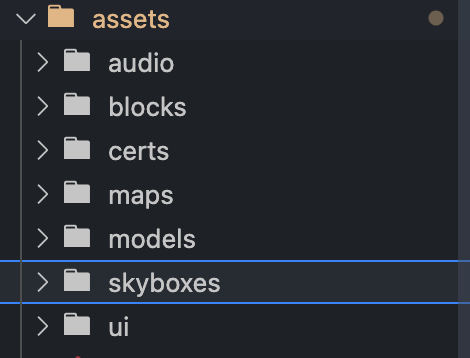 All of the different types of content that make up your game are called "Assets". Assets can be music, sound effects, block textures, cubemaps, GLTF models, images, videos, and more.